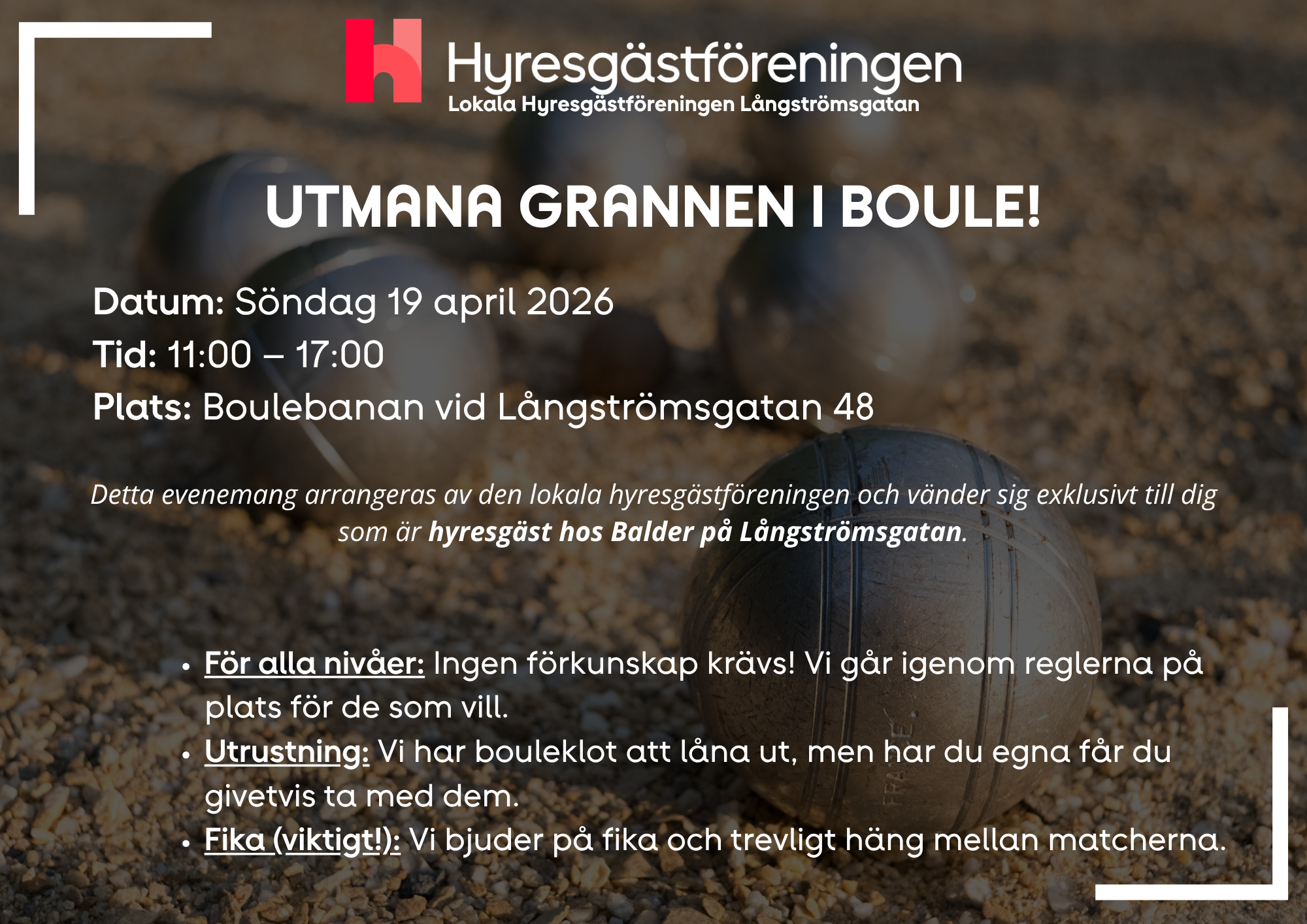 Boulebanan vid Långströmsgatan 48 Långströmsgatan 48, Göteborg, Västra Götaland, SwedenFör alla nivåer: Ingen förkunskap krävs! Vi går igenom reglerna på plats för de som vill. Utrustning: Vi har bouleklot att låna ut, men har du egna får du givetvis ta med dem. Fika (viktigt!): Vi bjuder på fika och trevligt häng mellan matcherna. Detta evenemang arrangeras av den lokala hyresgästföreningen och vänder sig exklusivt...