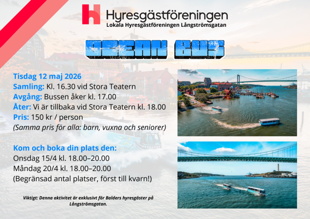Ăr du redo för en tur som gĂ„r frĂ„n asfalt till vĂ„gor? Nu bjuder vi in alla Balders hyresgĂ€ster pĂ„ LĂ„ngströmsgatan till en fartfylld tur med Oceanbus den 12 maj!